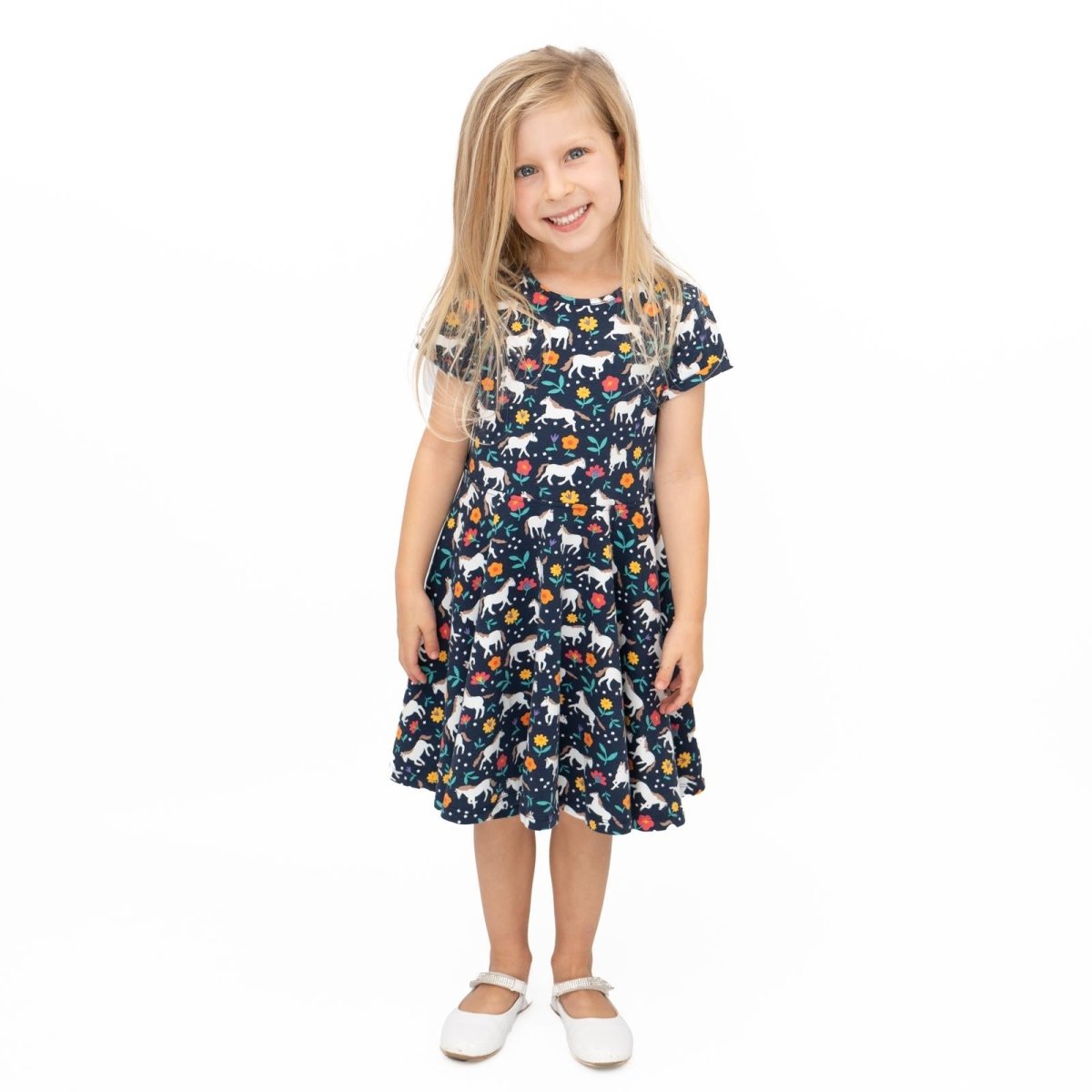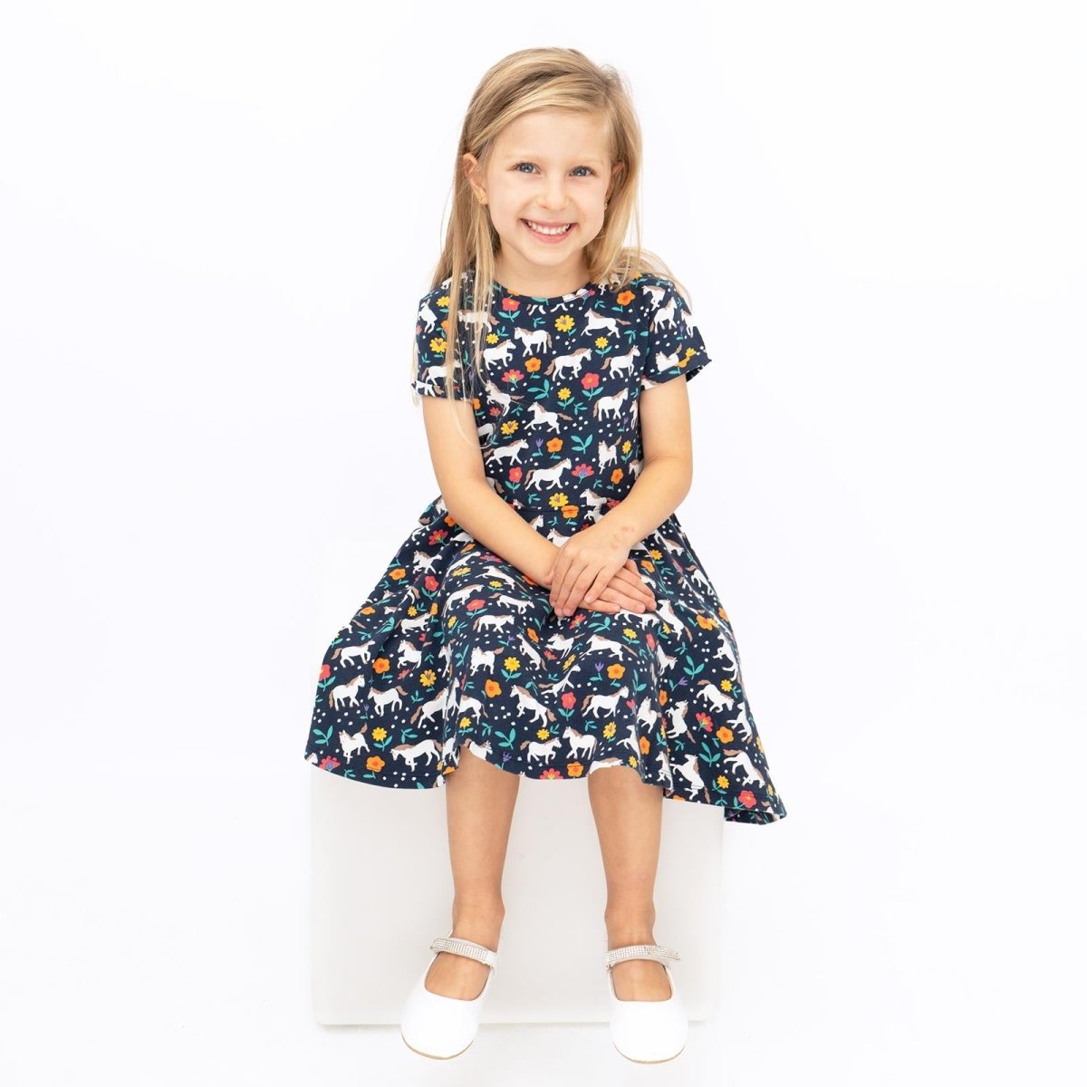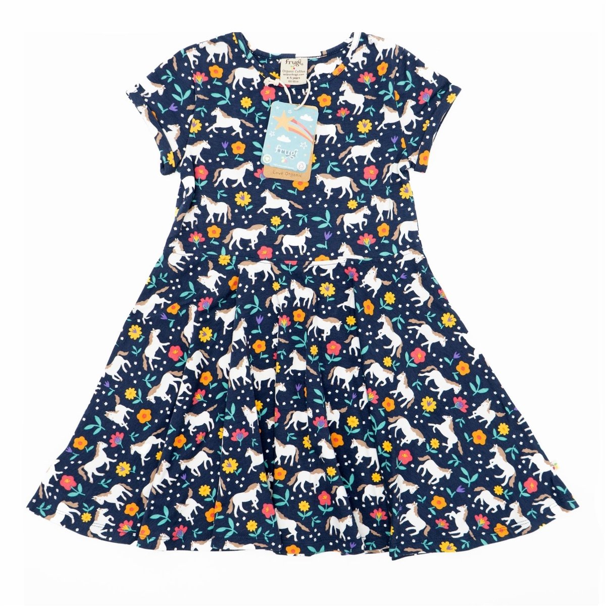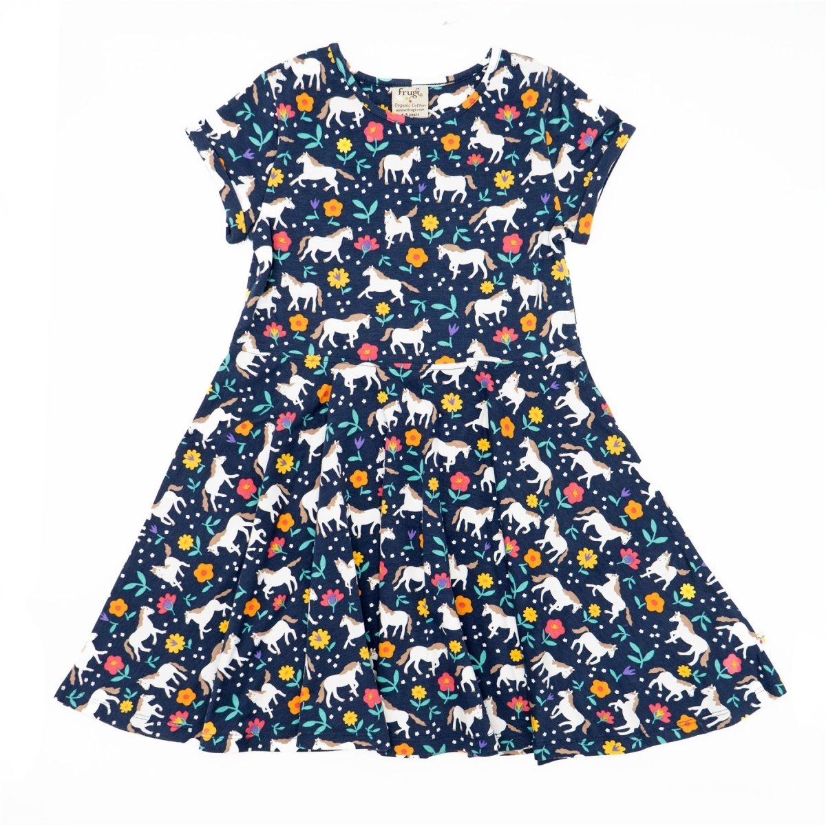 Frugi Baby Girls Dress Skater Indigo Navy Wild Horses Pretty Cotton Short Sleeve