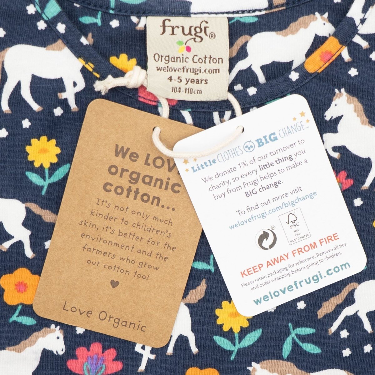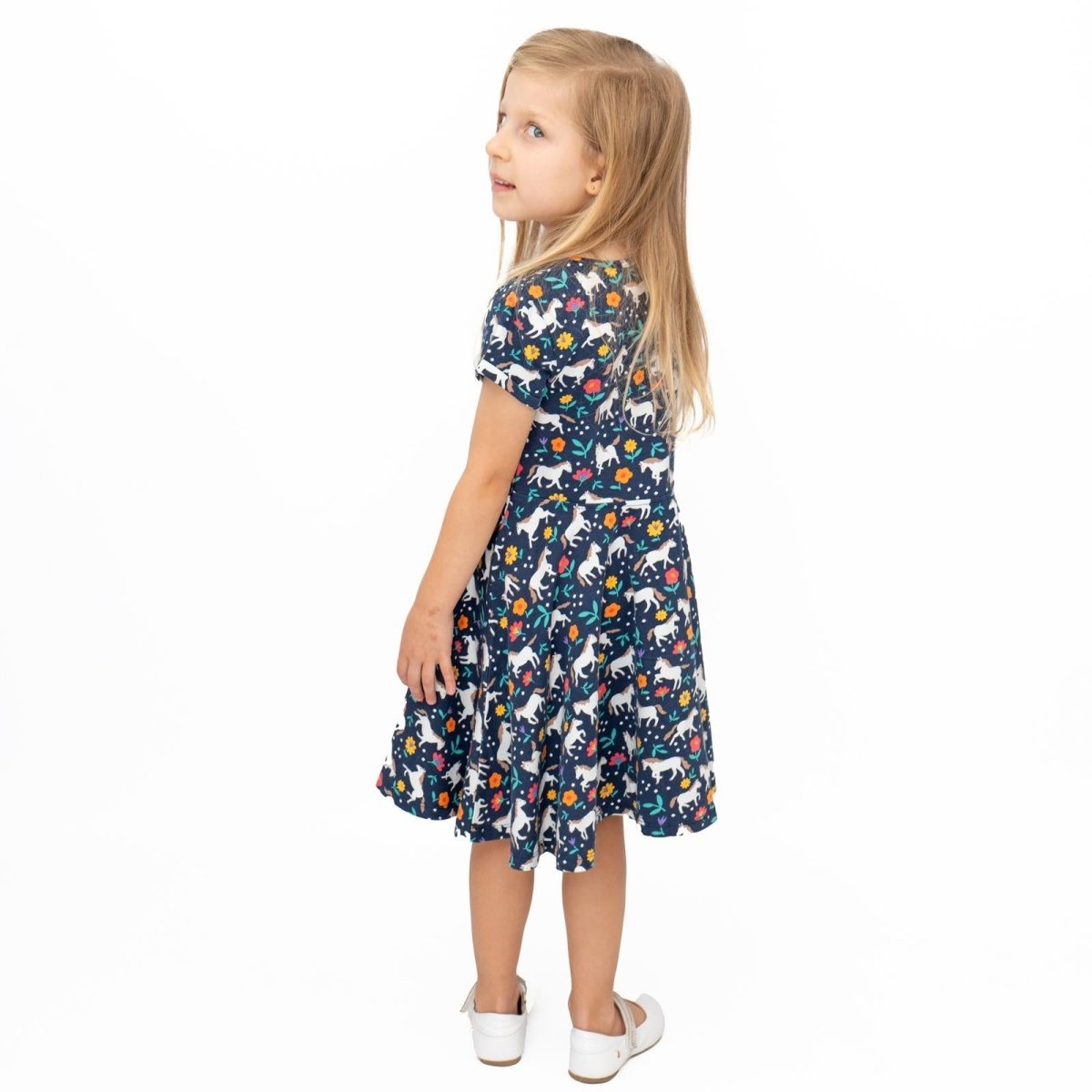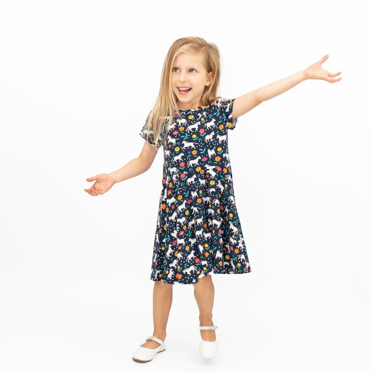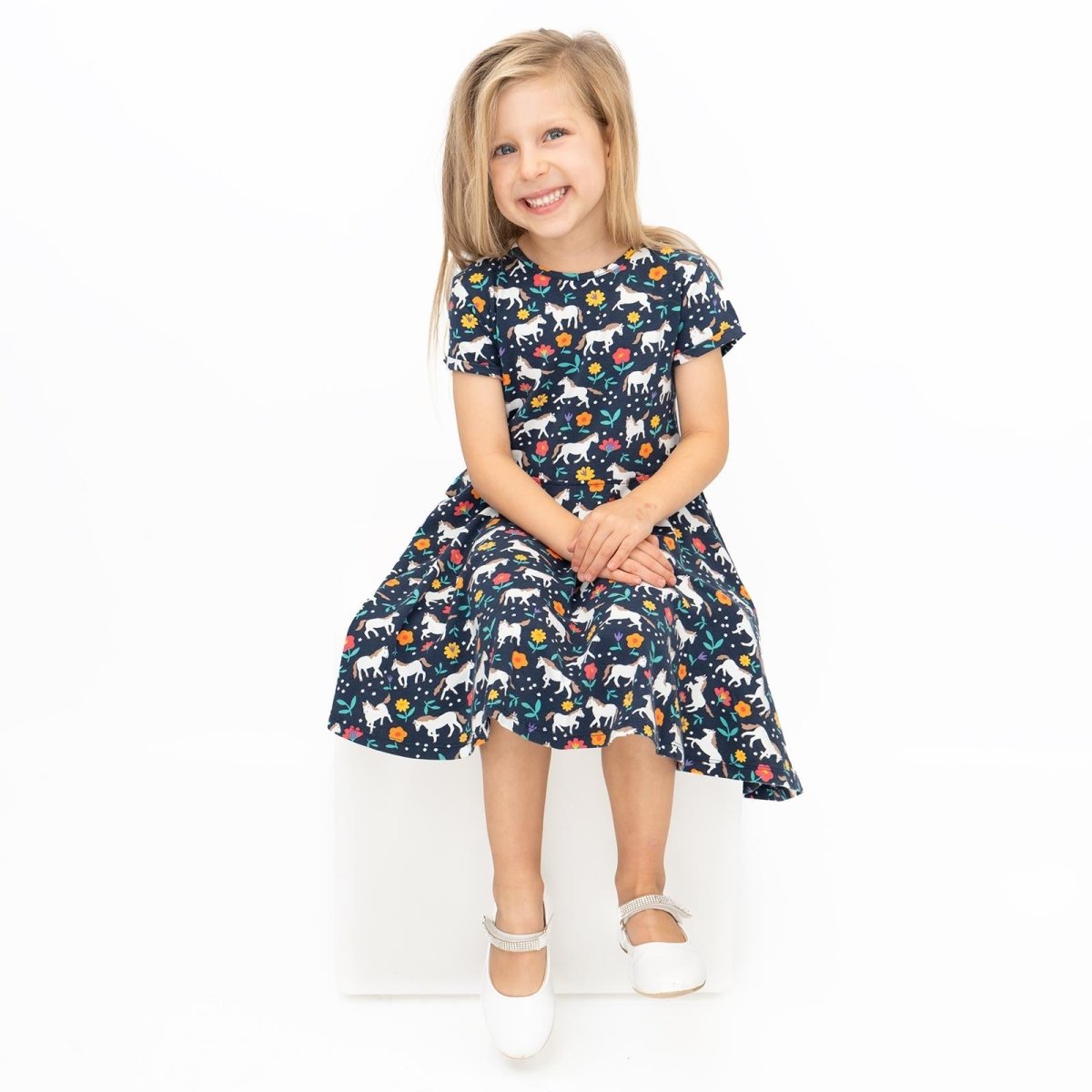 Frugi Baby Girls Dress Skater Indigo Navy Wild Horses Pretty Cotton Short Sleeve