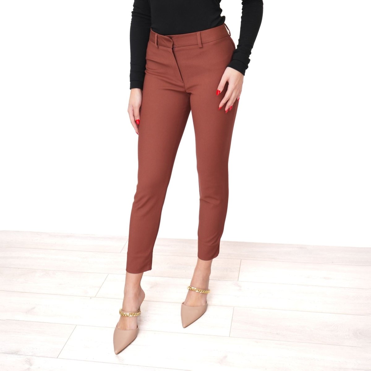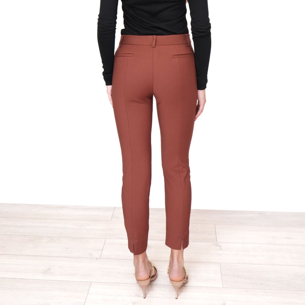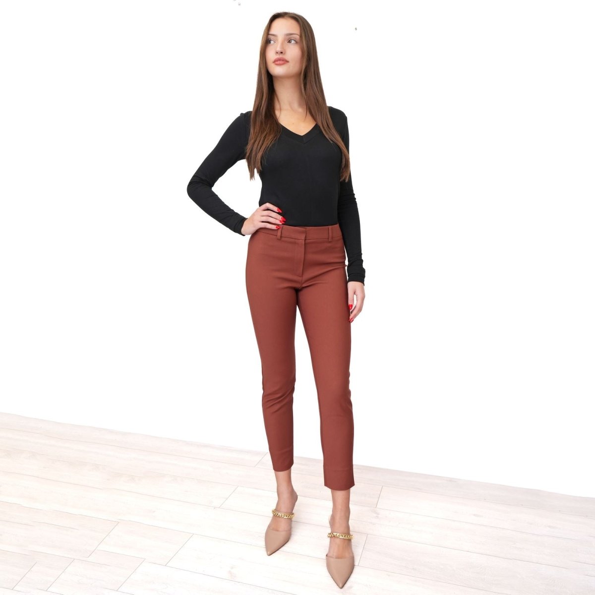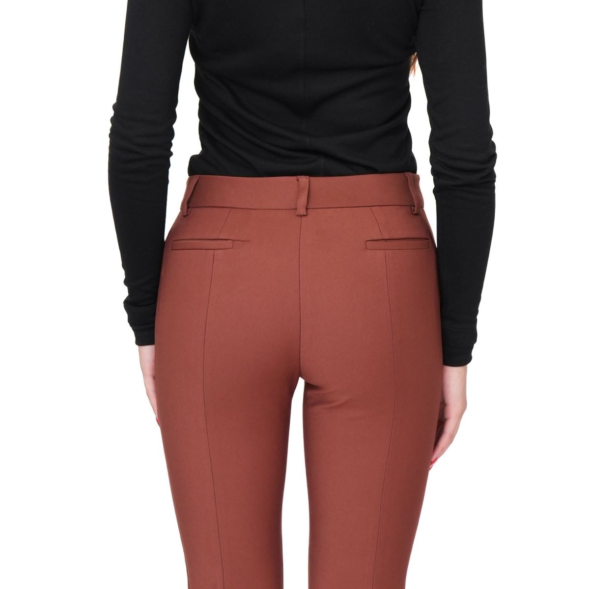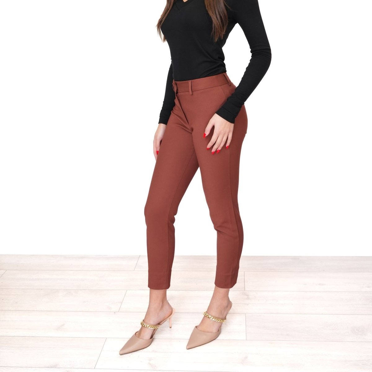 The mid-rise waist enhances comfort and shape, while the slim leg creates a clean, elongated silhouette. Designed to gently contour and flatter, these trousers move seamlessly from office settings to evening occasions. Pair with a tailored blazer for professional polish or style with a soft knit for effortless smart-casual appeal.