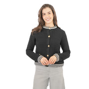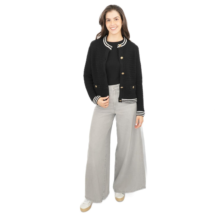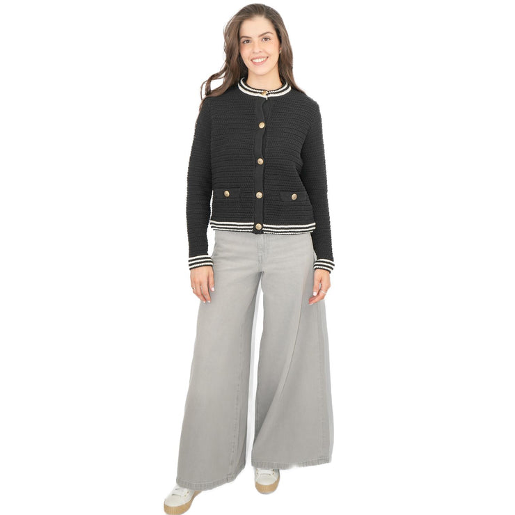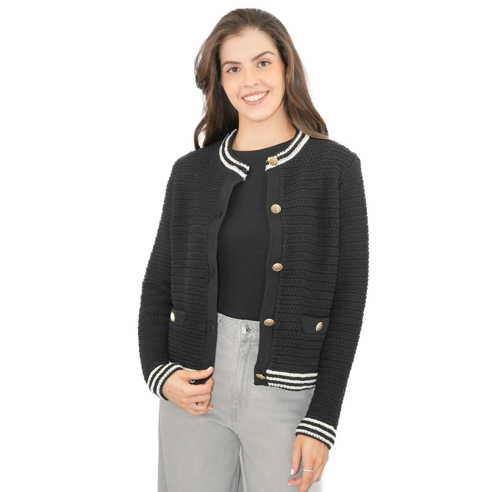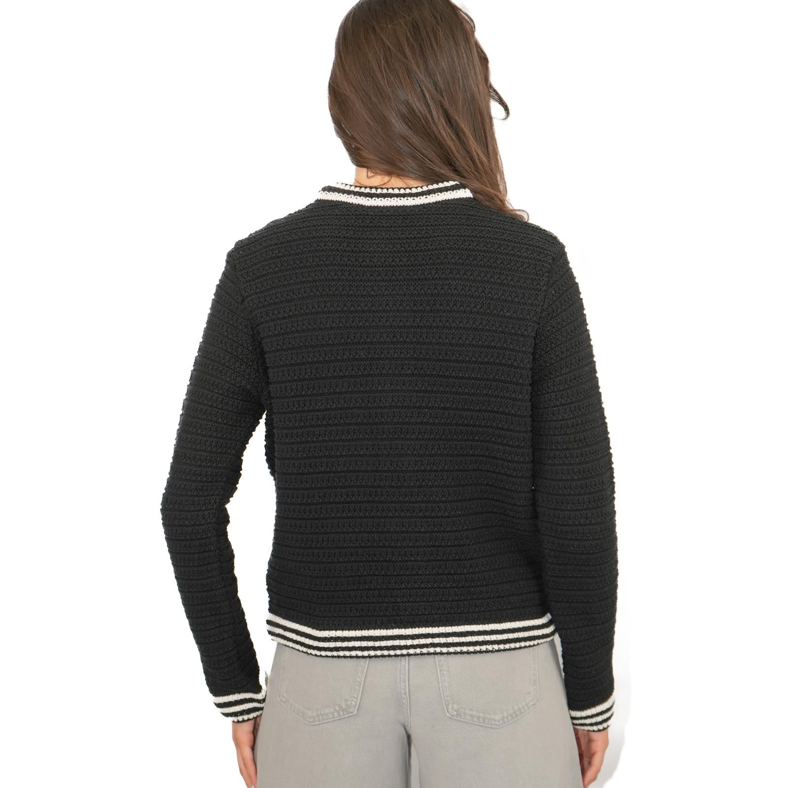 Design Details: Textured knit with tipped trims at the neckline, cuffs, and hem