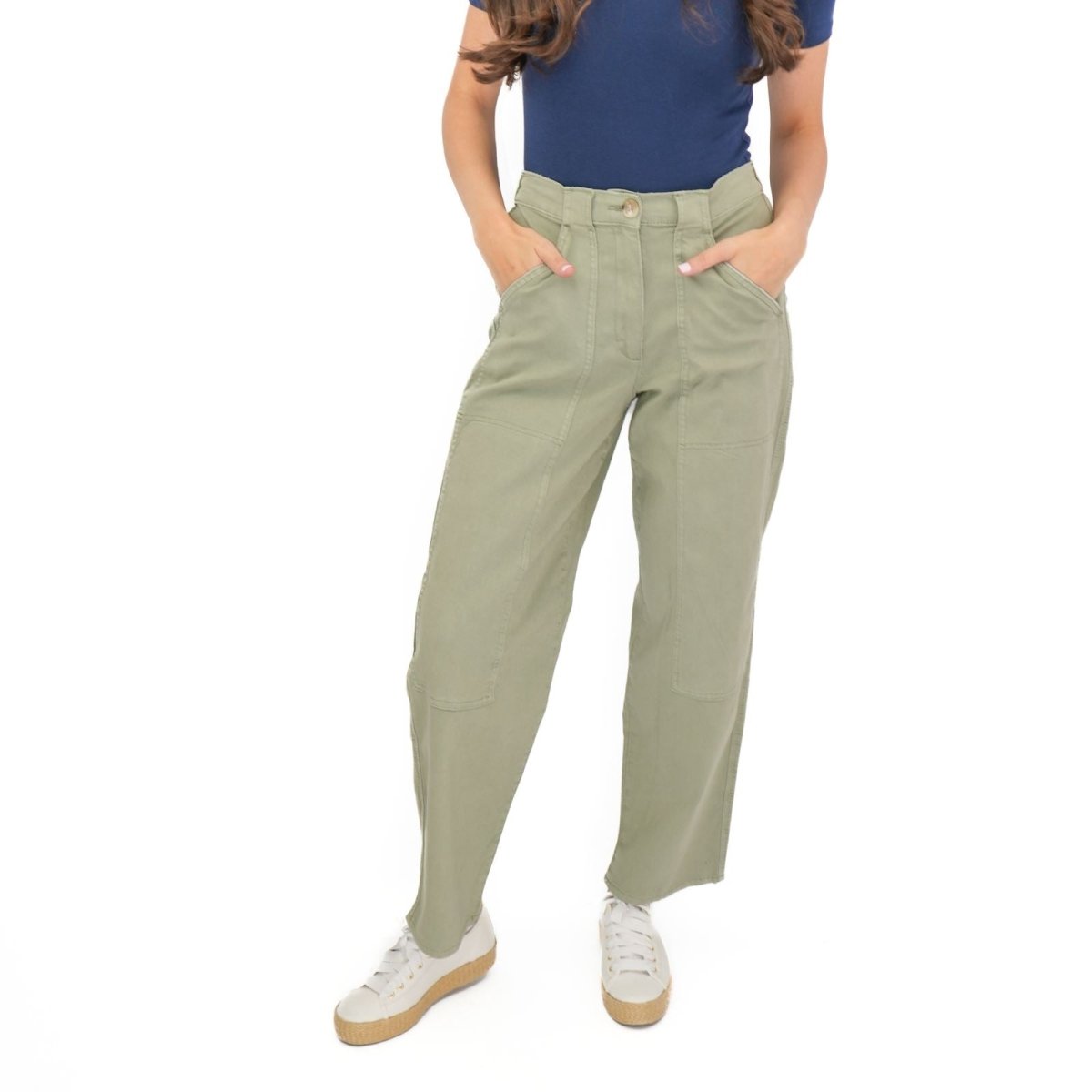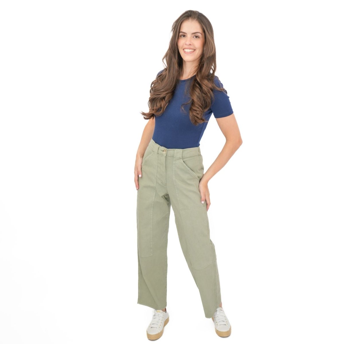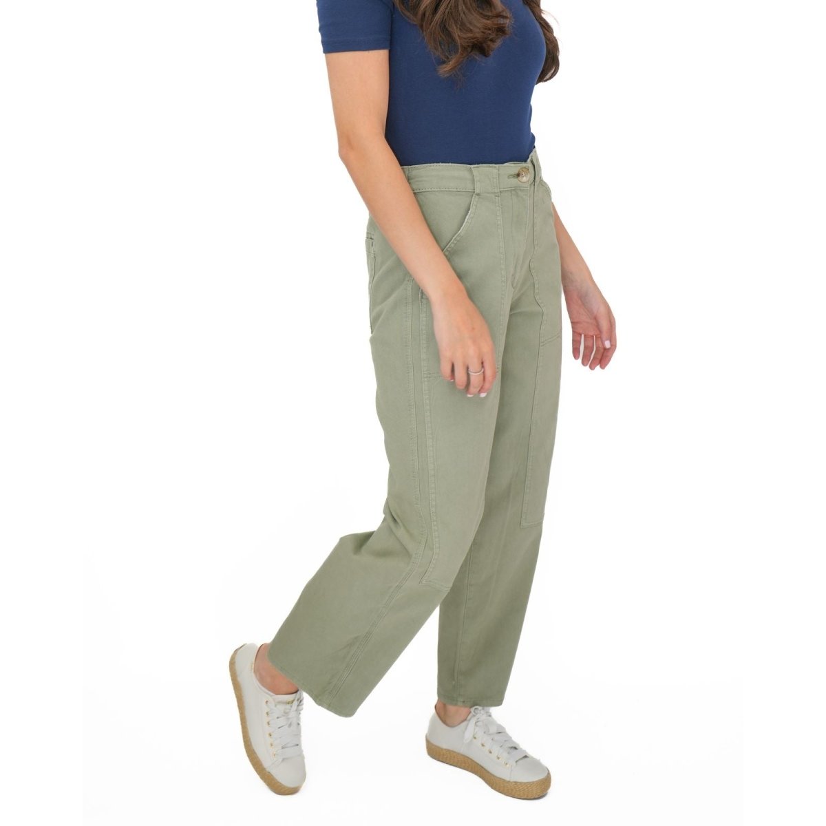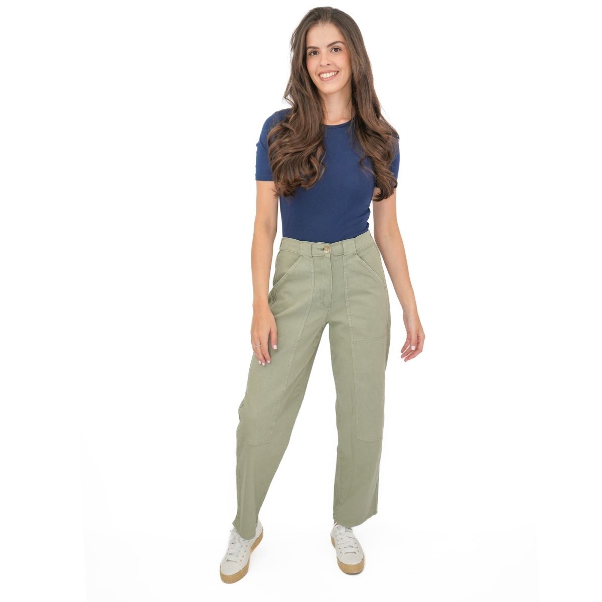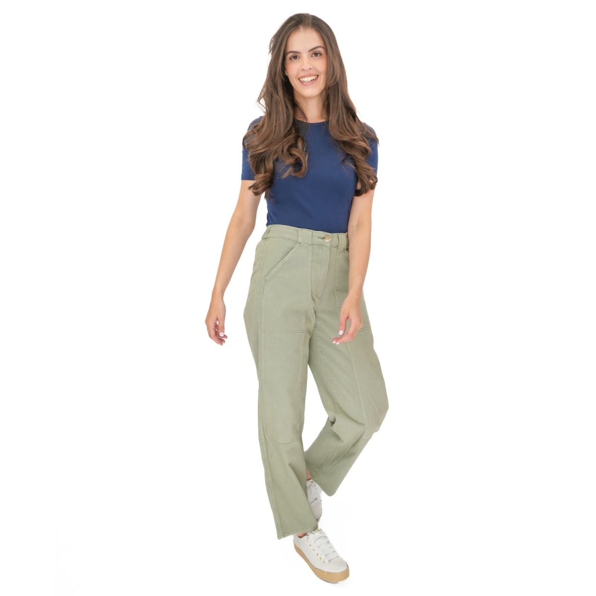 These trousers feature a straight leg silhouette with a relaxed fit, offering a comfortable and flattering shape suitable for casual wear, work or travel. The design includes a zip and button fastening, along with functional pockets for added practicality.