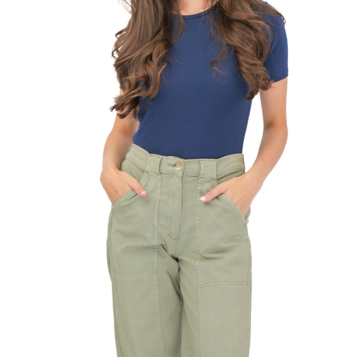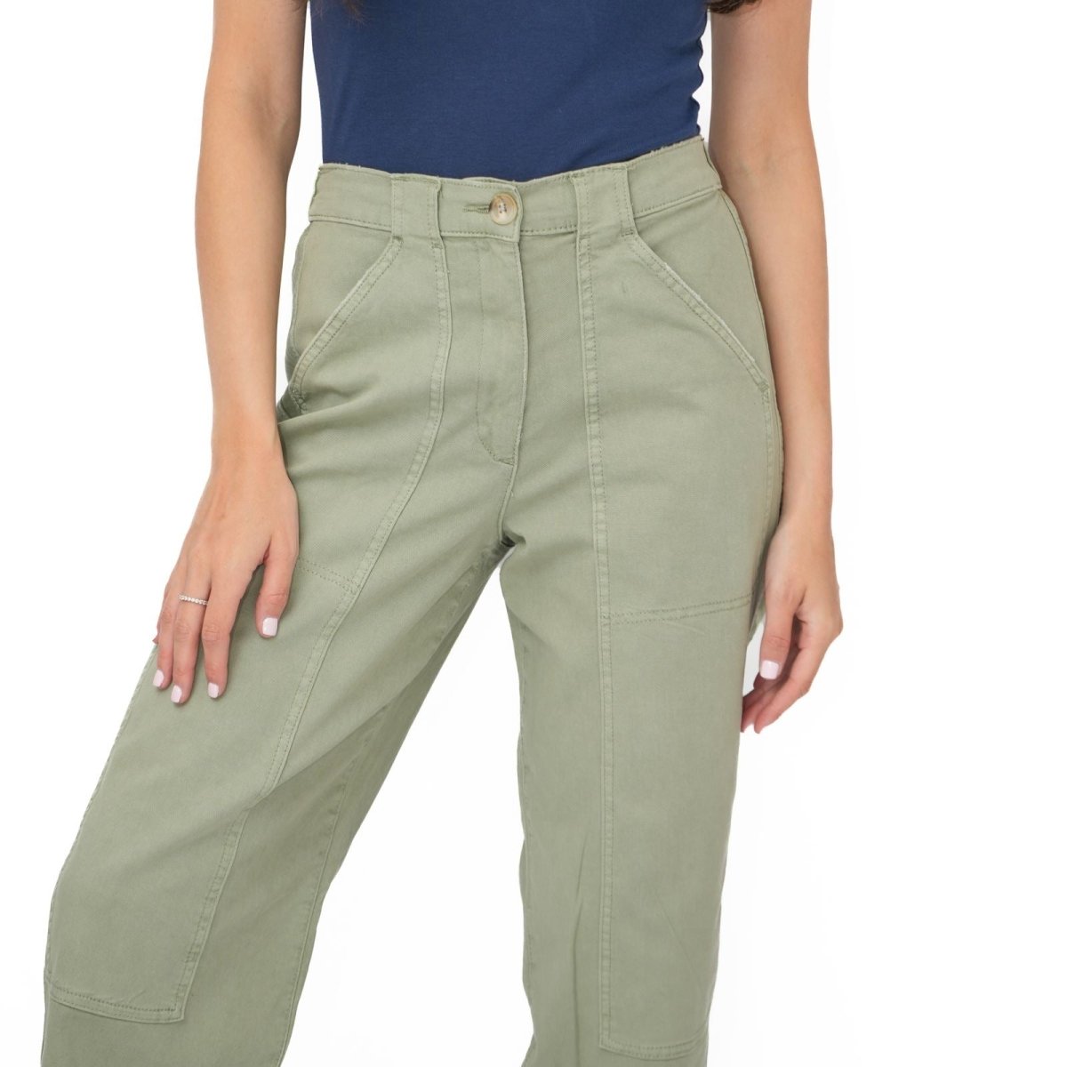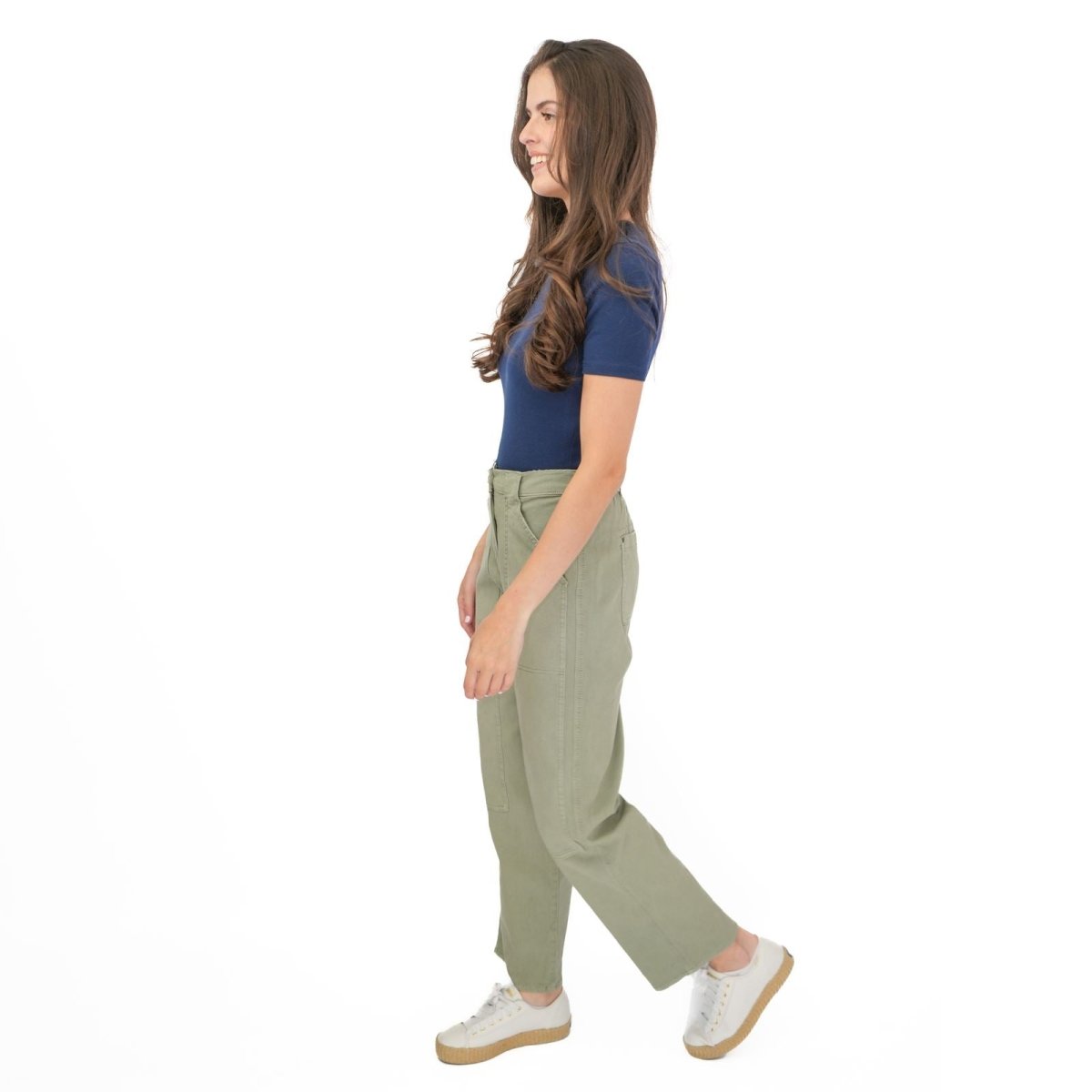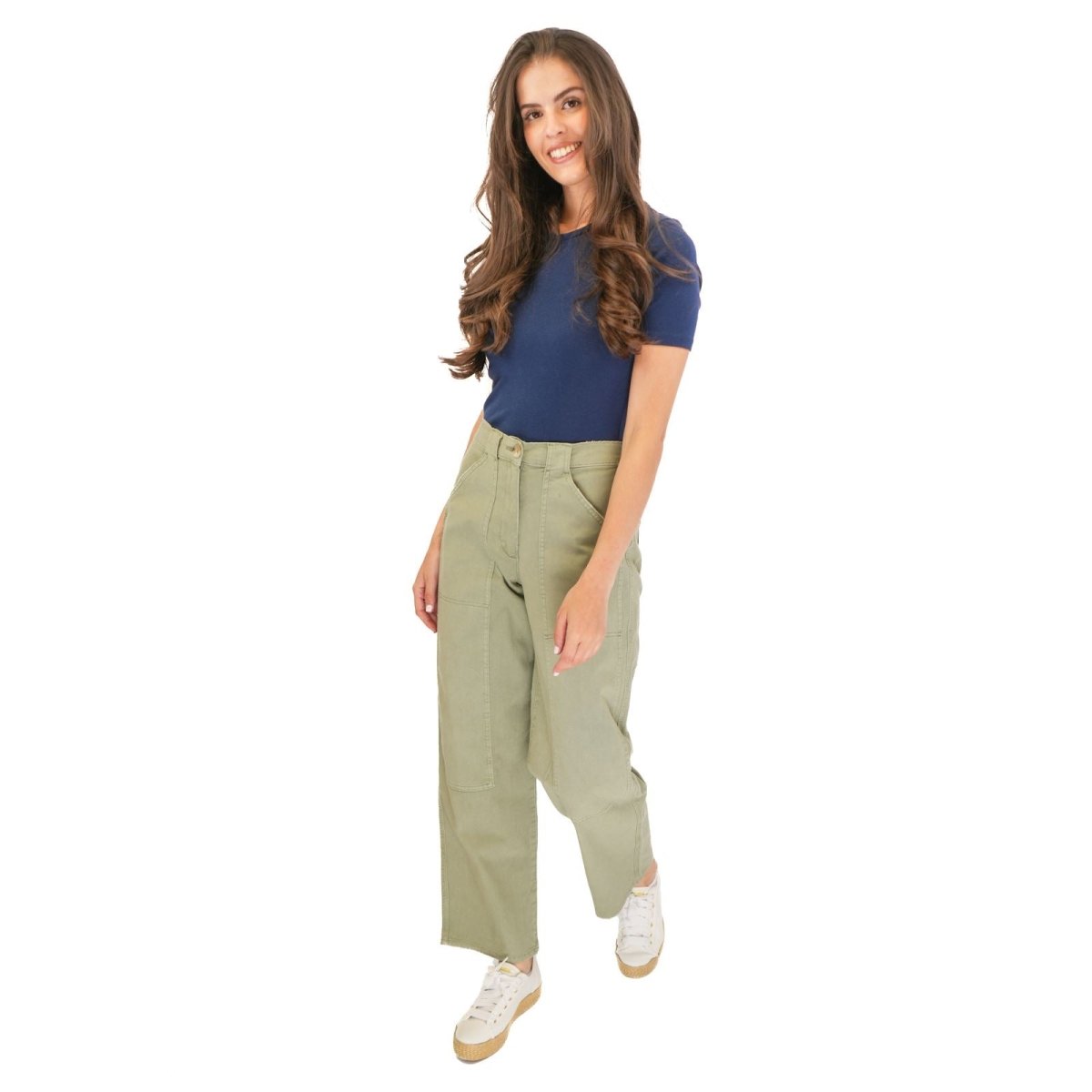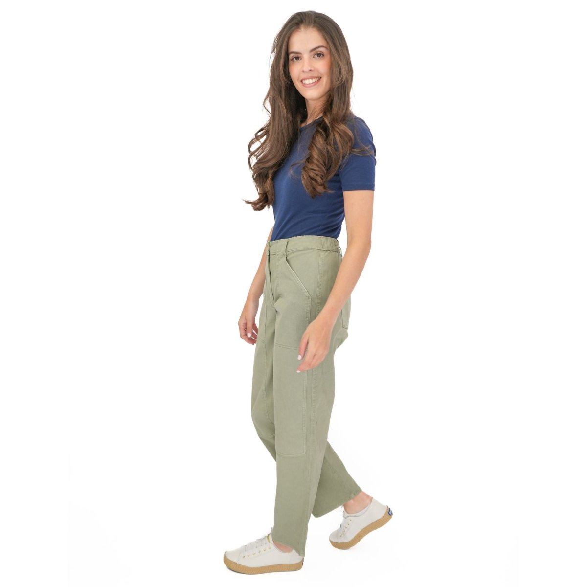 These trousers feature a straight leg silhouette with a relaxed fit, offering a comfortable and flattering shape suitable for casual wear, work or travel. The design includes a zip and button fastening, along with functional pockets for added practicality.