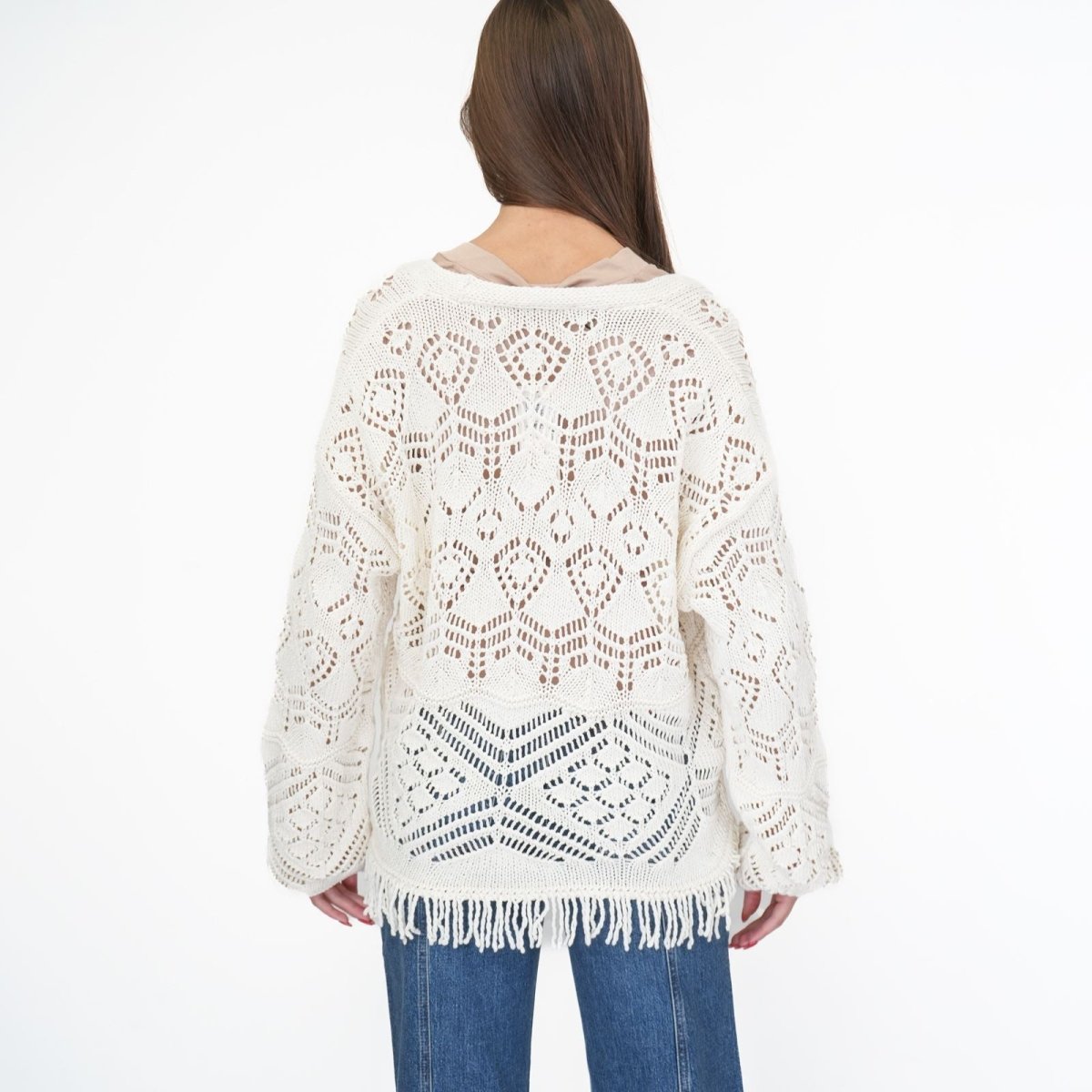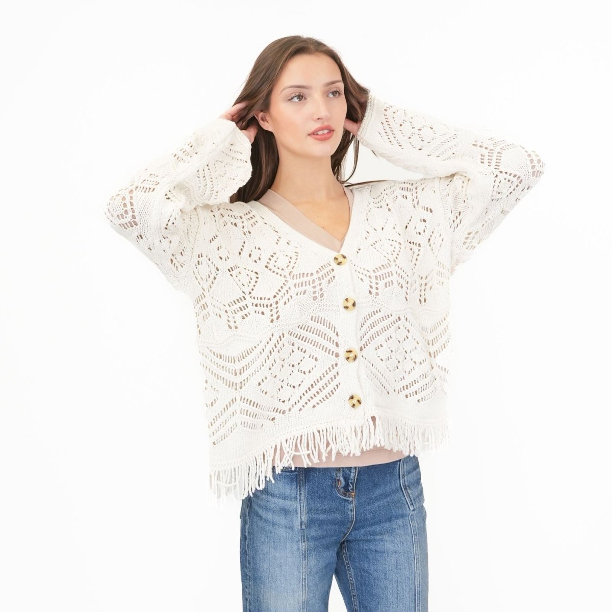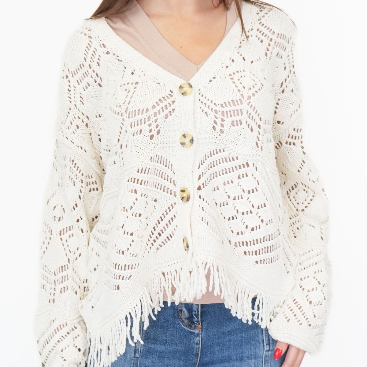 The flattering V-neckline pairs seamlessly with tees, blouses or dresses, while the cropped length and fringe detailing elevate a classic silhouette with a playful, fashion-forward vibe.