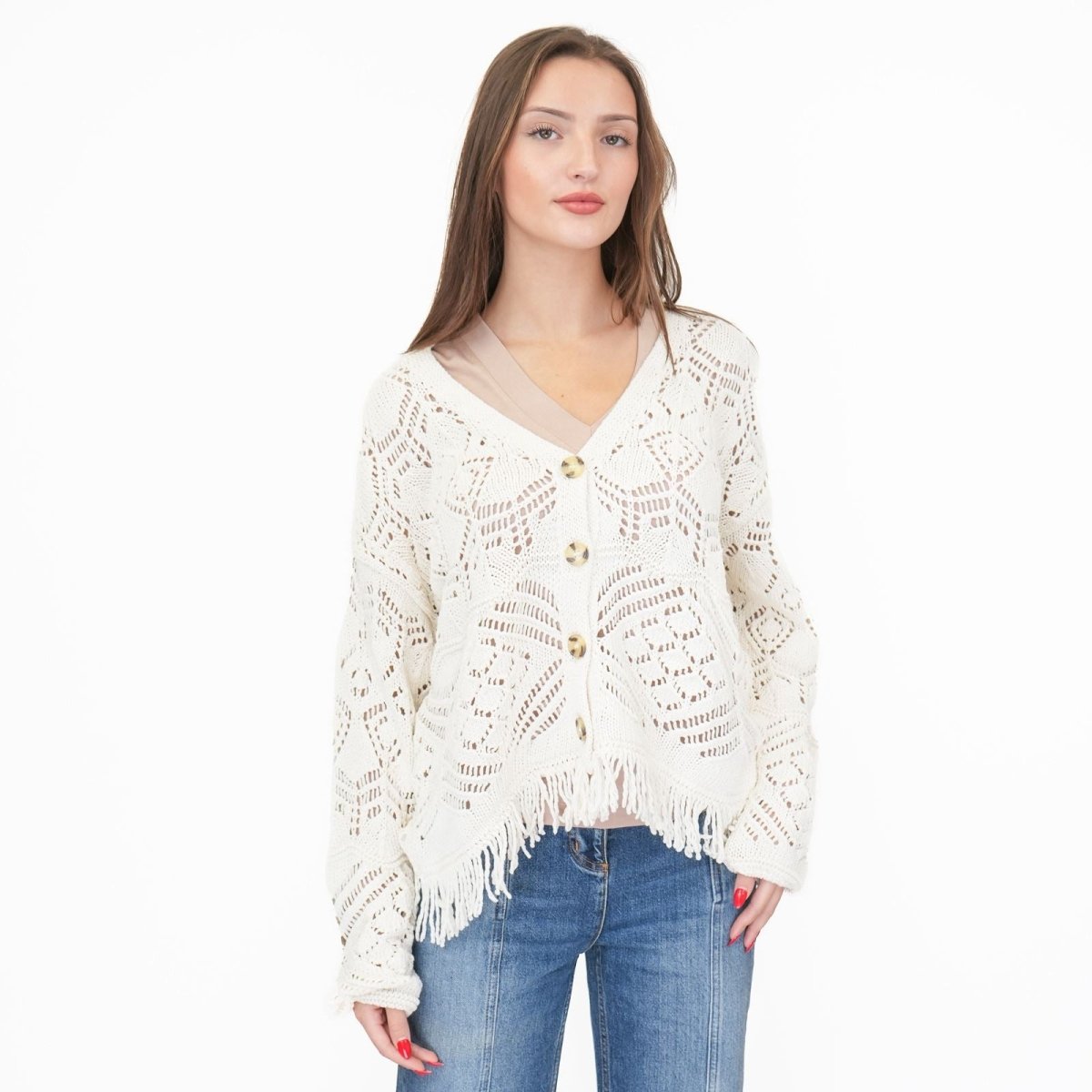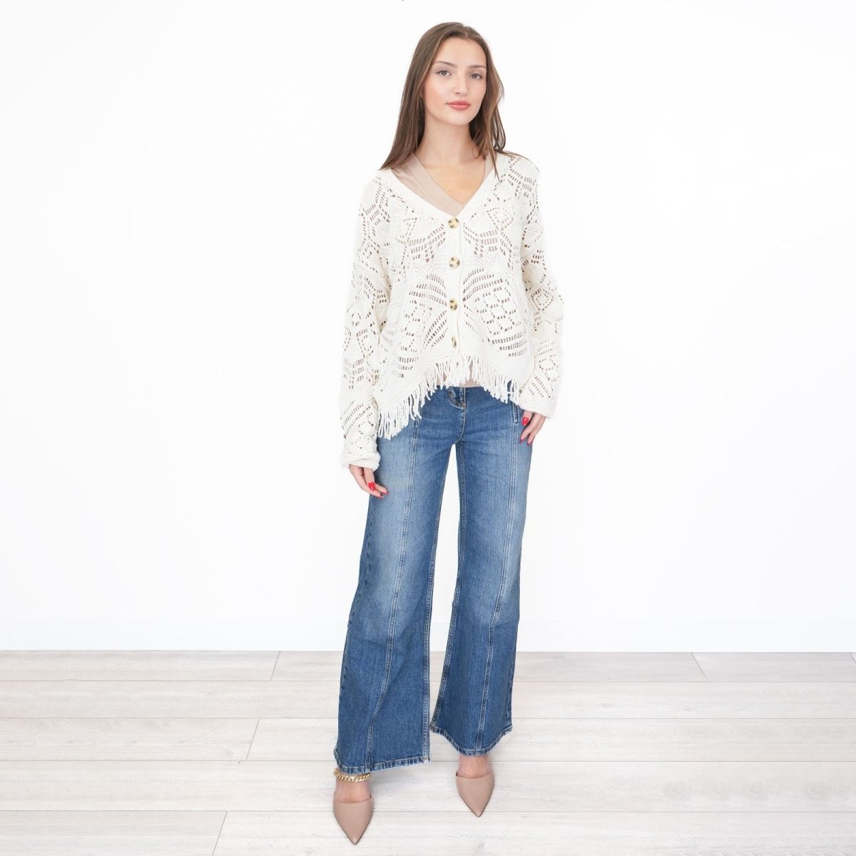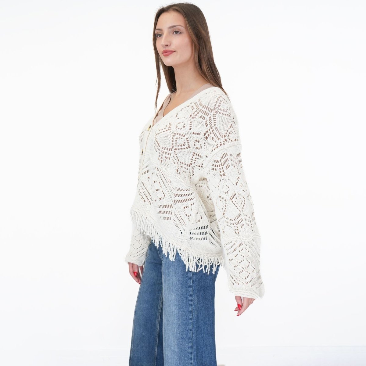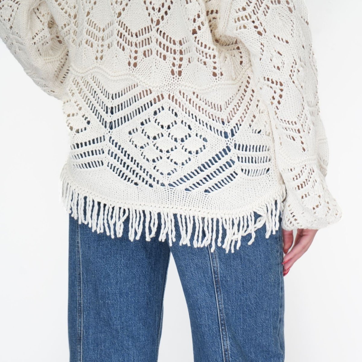The flattering V-neckline pairs seamlessly with tees, blouses or dresses, while the cropped length and fringe detailing elevate a classic silhouette with a playful, fashion-forward vibe.
