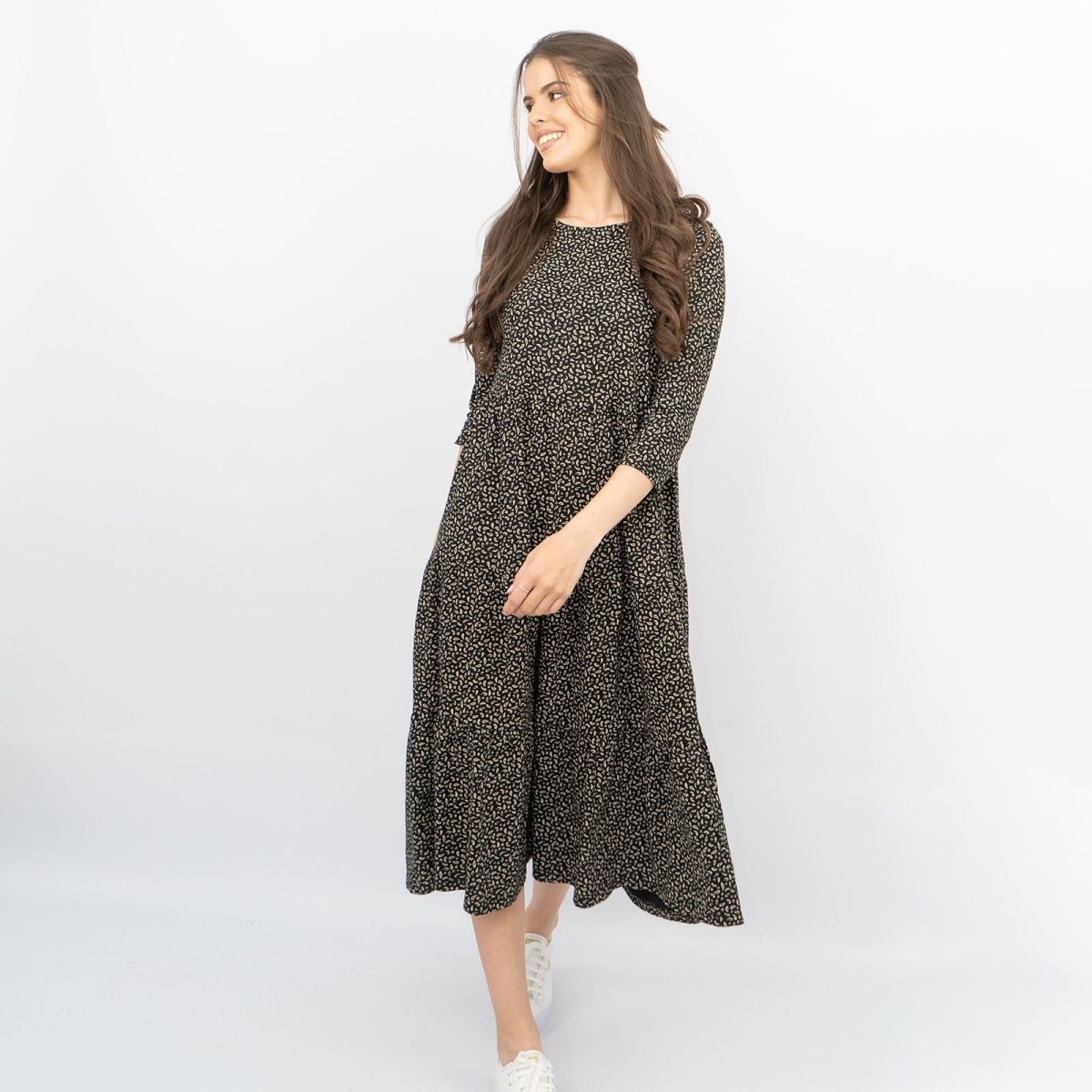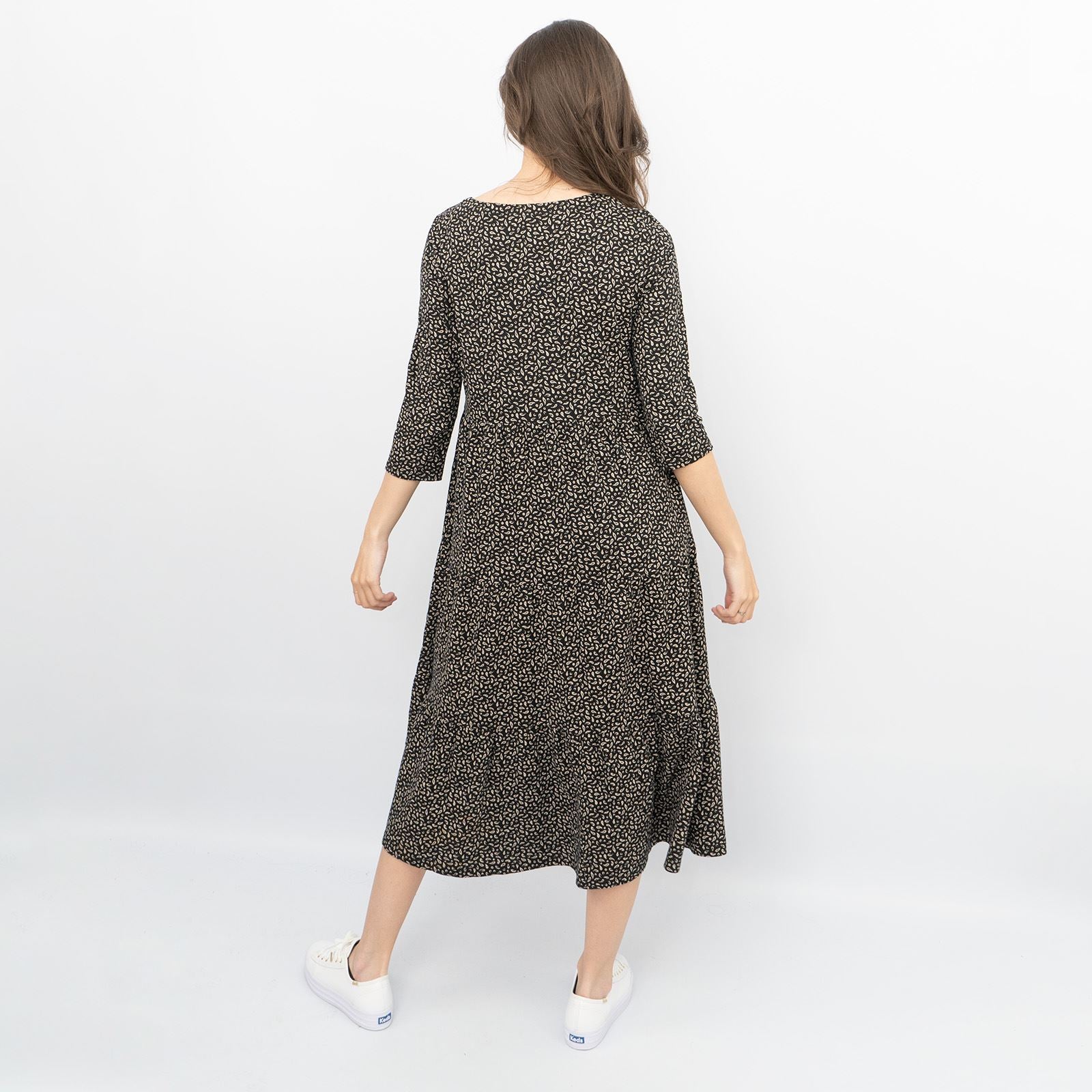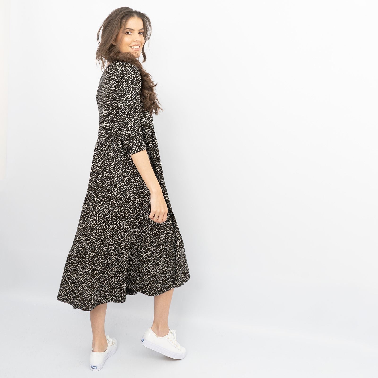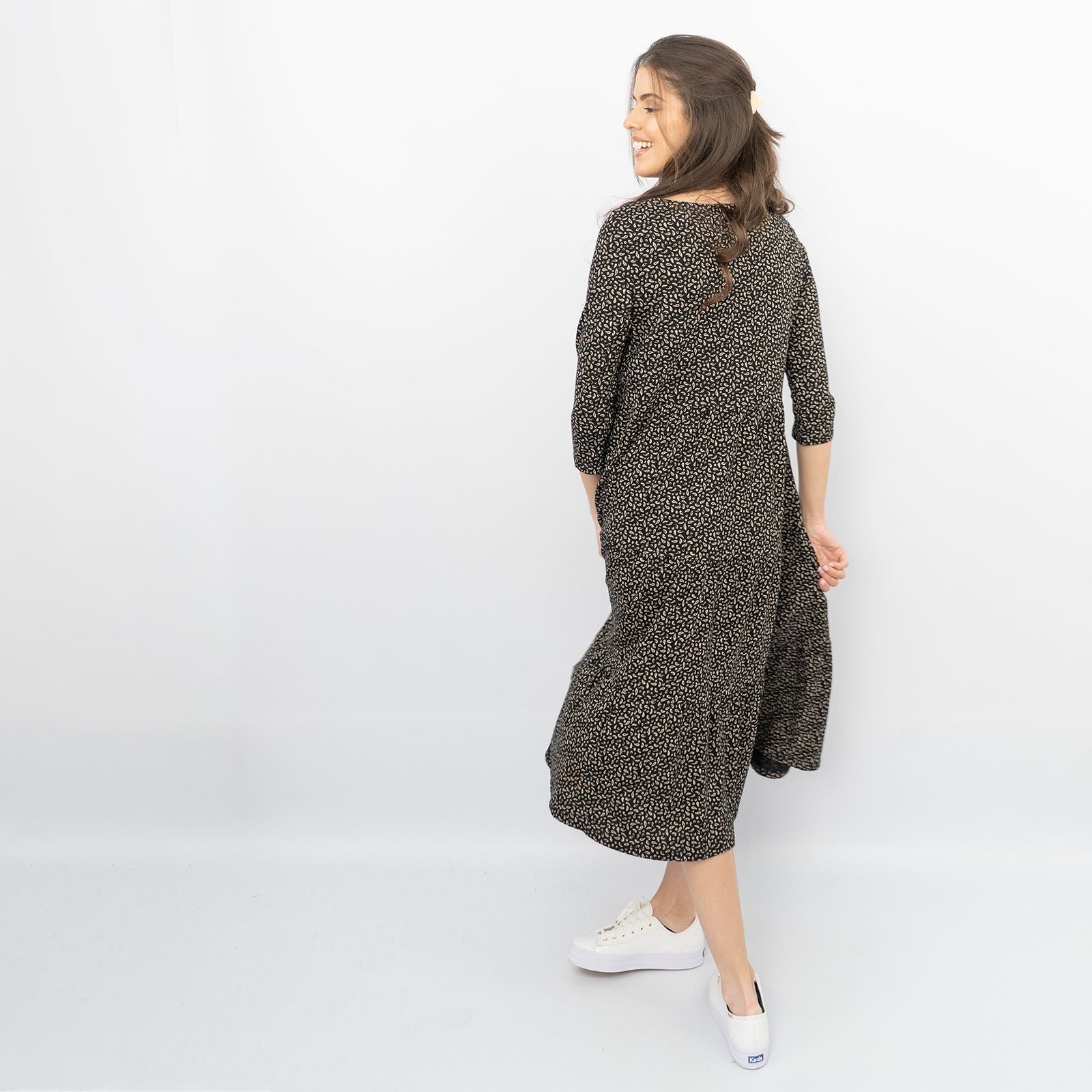 A relaxed fit, feminine dress with three floaty tiers finished with soft gathers, giving it a gorgeous swish. We've made it just a little longer for this season, finishing above the ankle. Made from breathable, easy to wear cotton jersey in a rich colour or delicate handcrafted print, with 3/4 length sleeves and a round neck.
