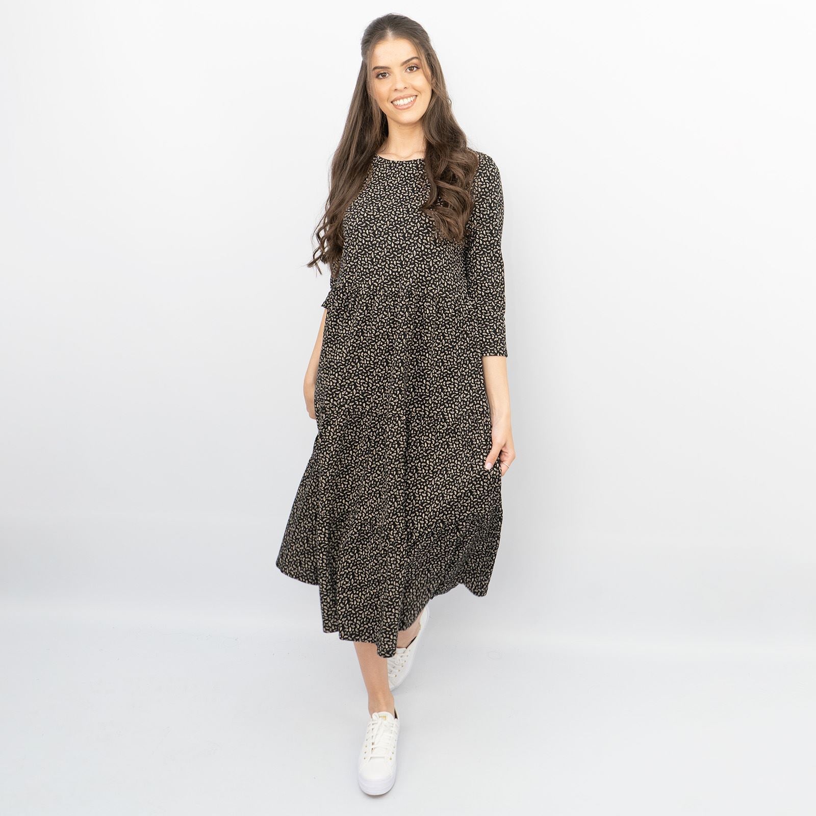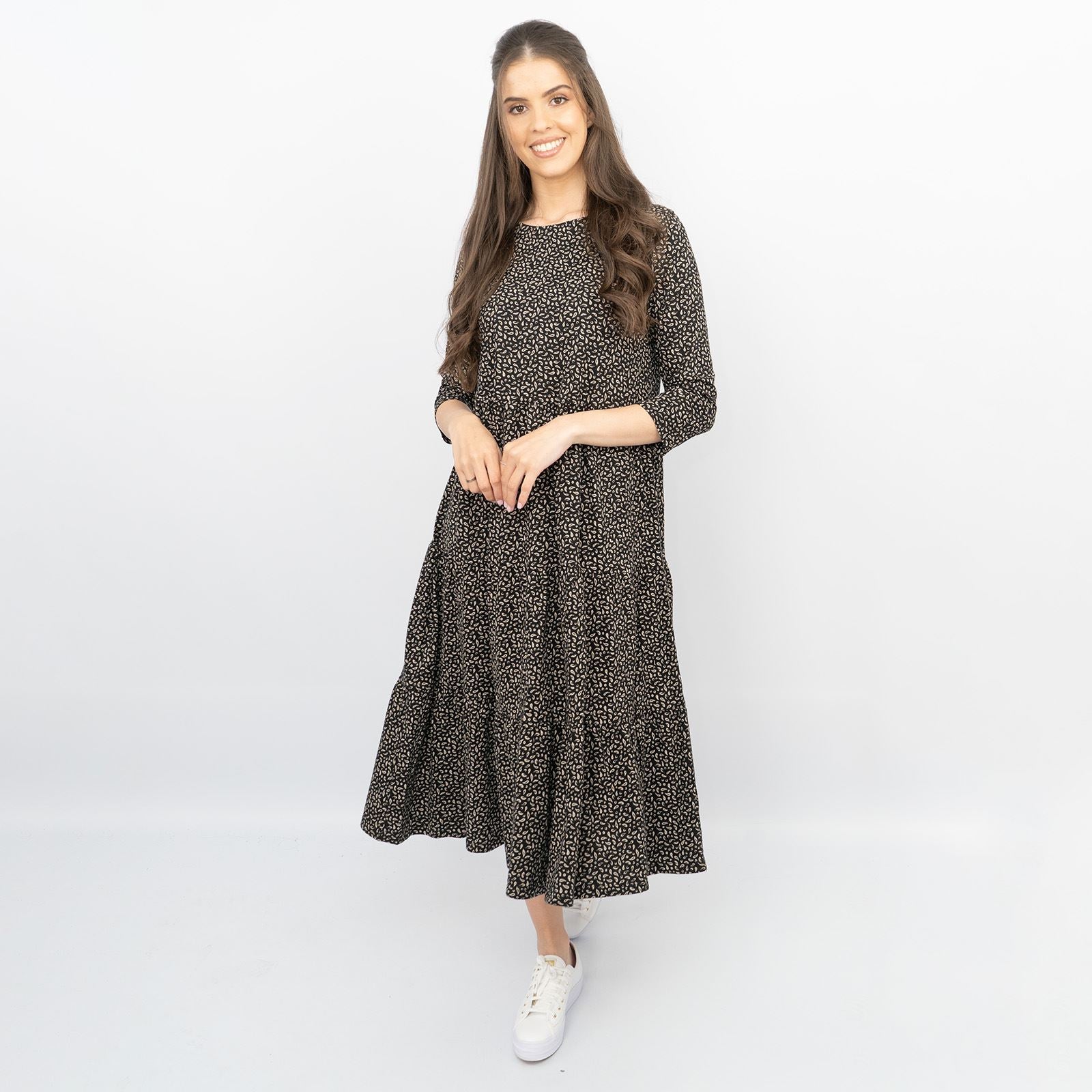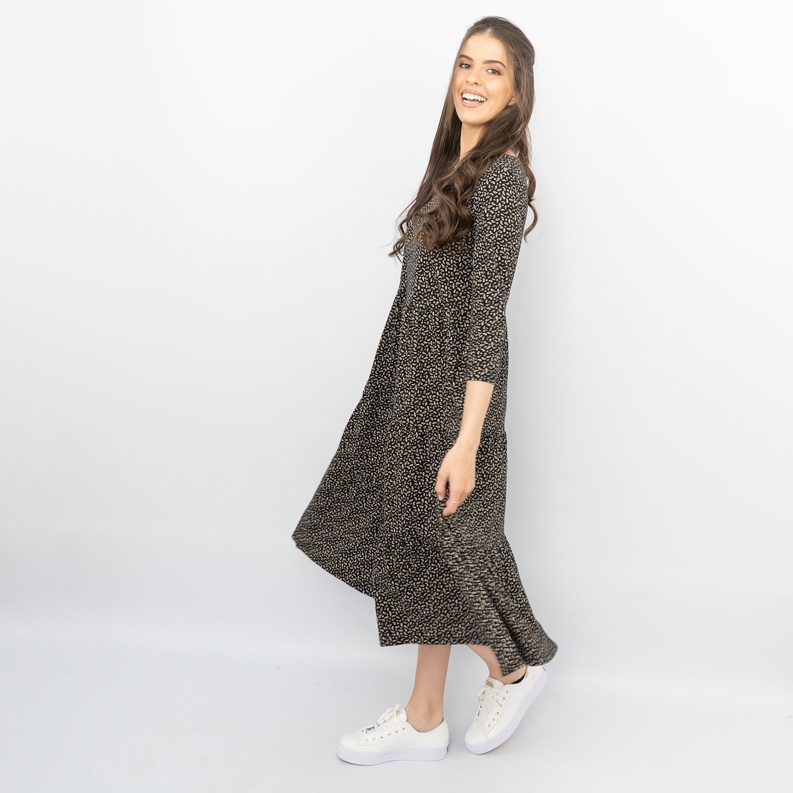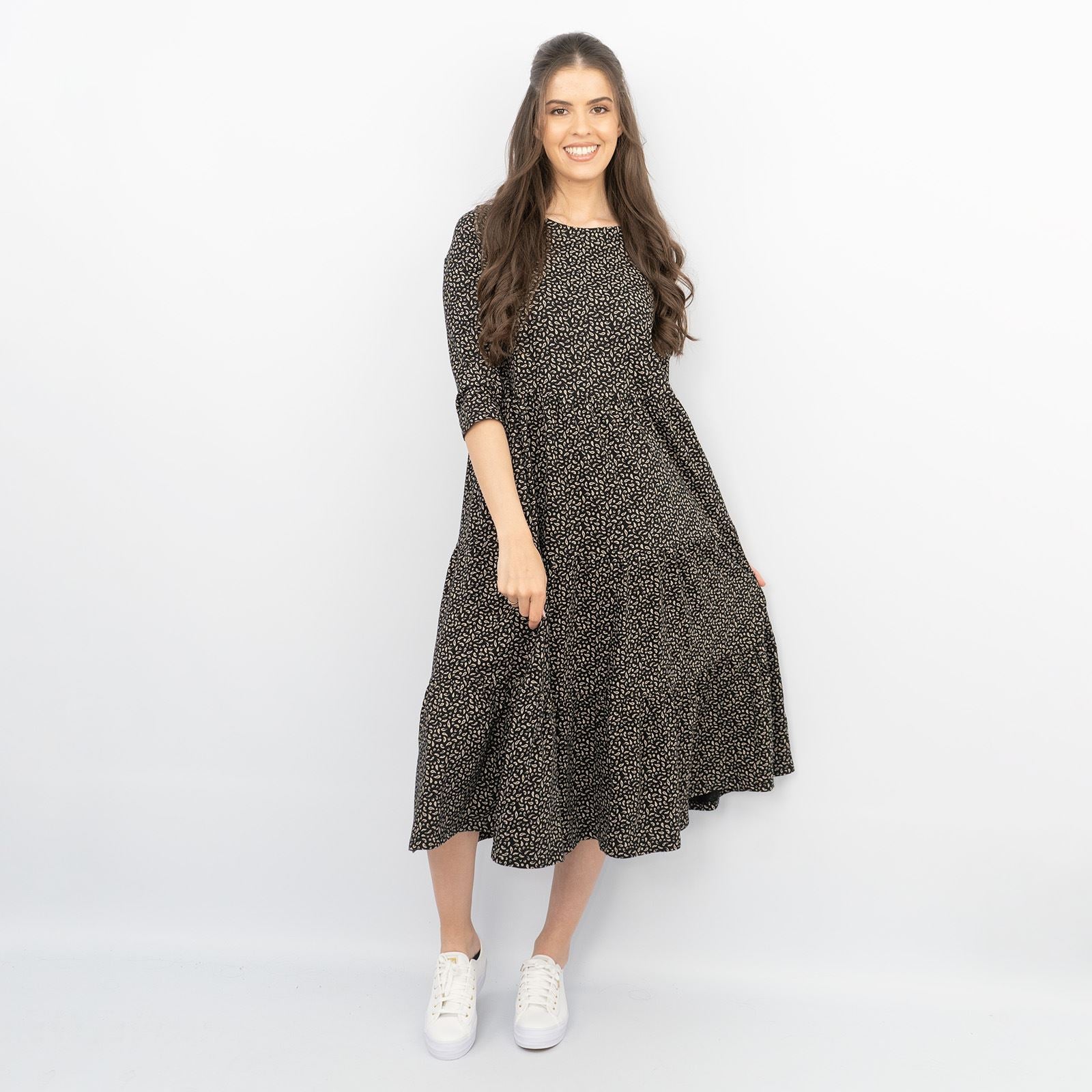 A relaxed fit, feminine dress with three floaty tiers finished with soft gathers, giving it a gorgeous swish. We've made it just a little longer for this season, finishing above the ankle. Made from breathable, easy to wear cotton jersey in a rich colour or delicate handcrafted print, with 3/4 length sleeves and a round neck.