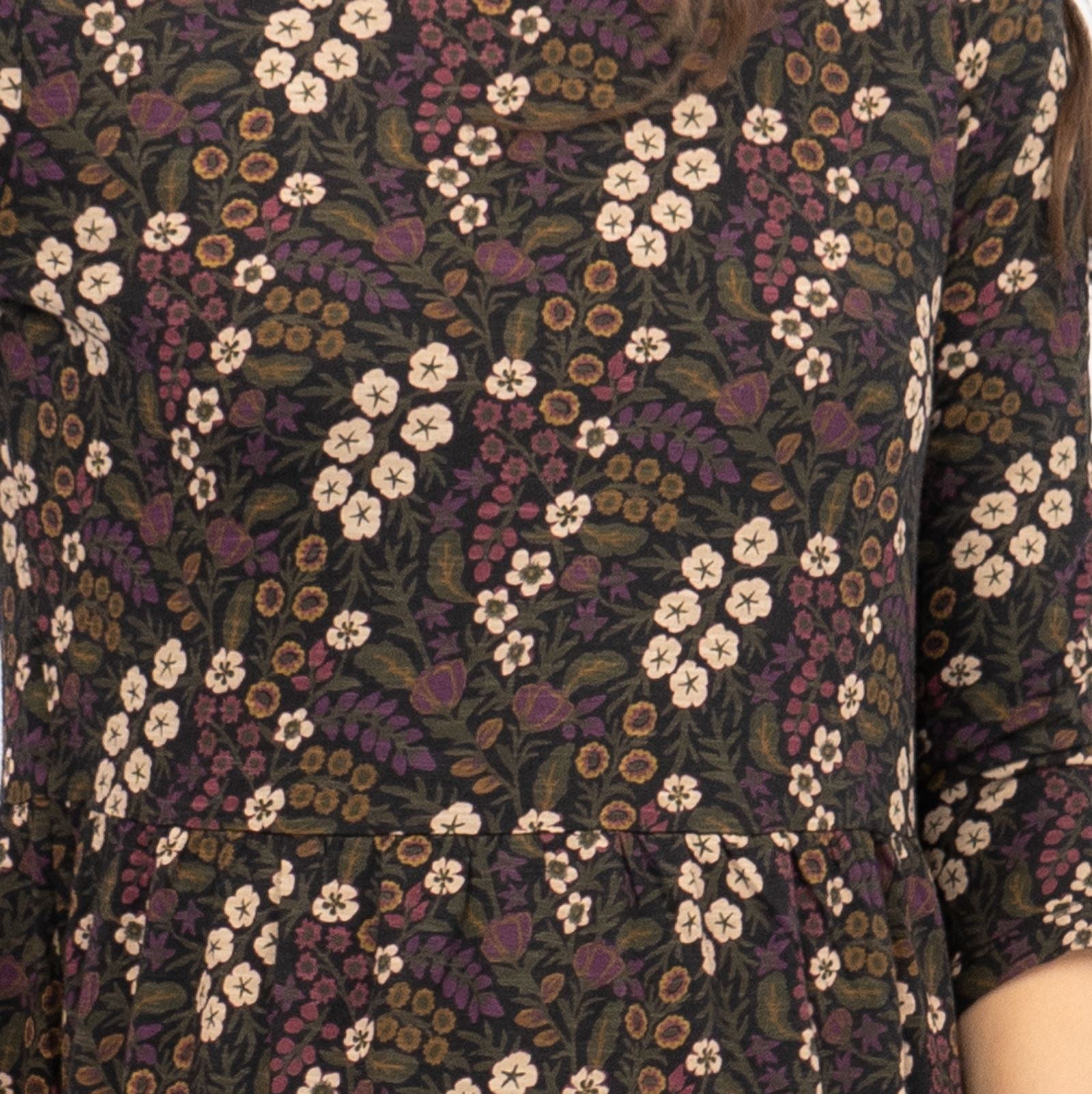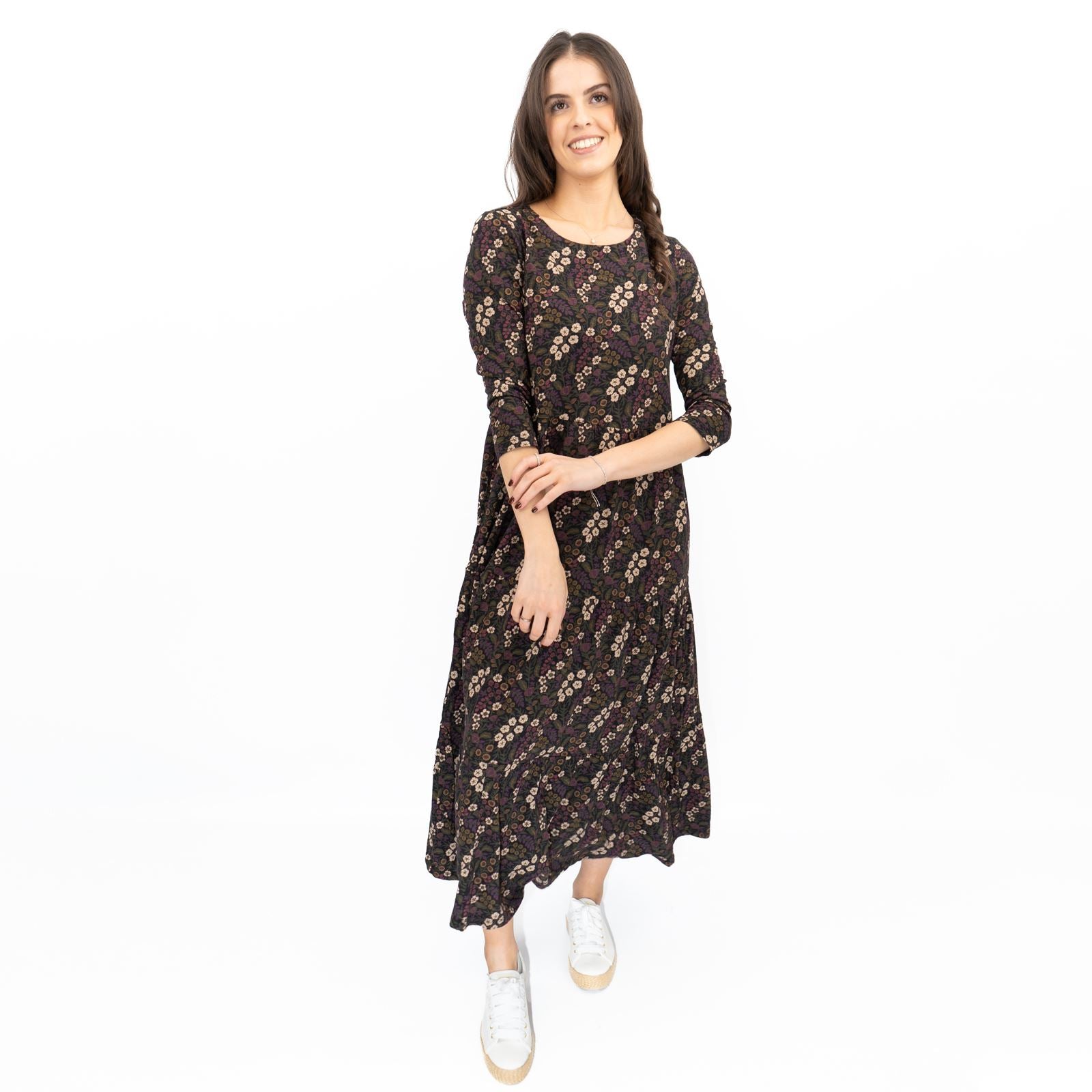A relaxed-fit, feminine dress featuring three airy tiers with soft gathers for an elegant swish. Crafted from breathable, easy-to-wear cotton jersey, it comes in a rich hue or a delicate handcrafted print, complete with 3/4 length sleeves and a classic round neckline.