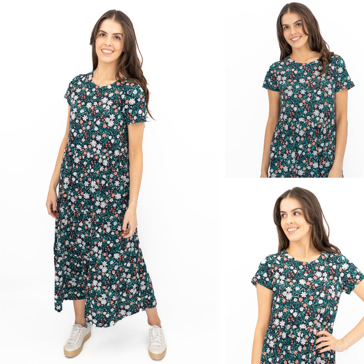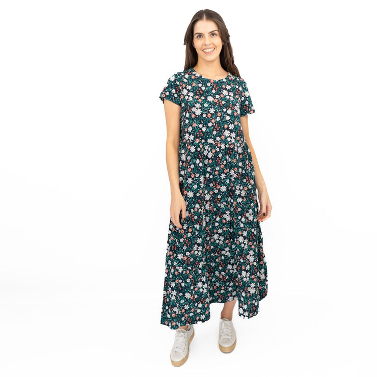 A relaxed-fit, feminine dress featuring three airy tiers with soft gathers for an elegant swish. Crafted from breathable, easy-to-wear cotton jersey, it comes in a rich hue or a delicate handcrafted print, complete with 3/4 length sleeves and a classic round neckline.