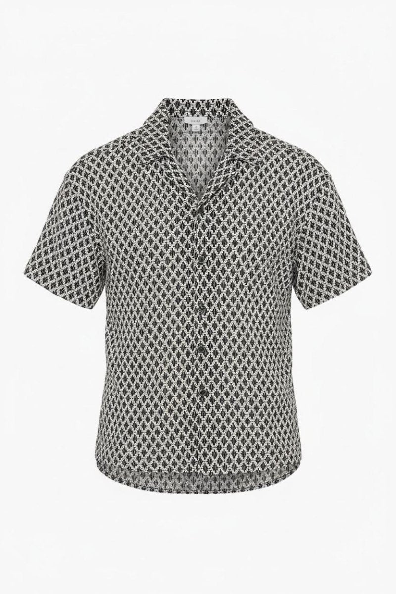 Reiss Sterling Short Sleeve Cuban Collar Geometric Crochet Shirt – Navy & White