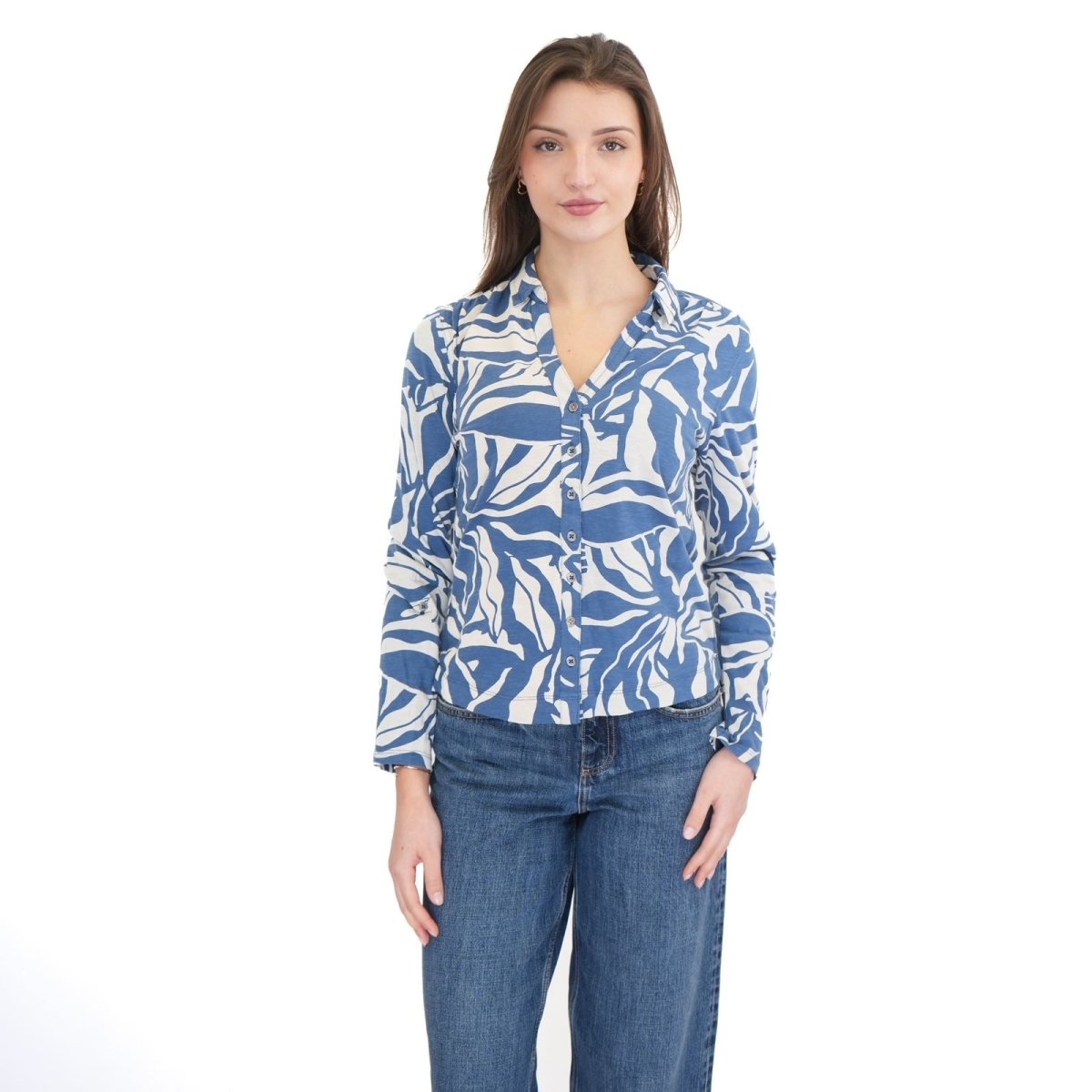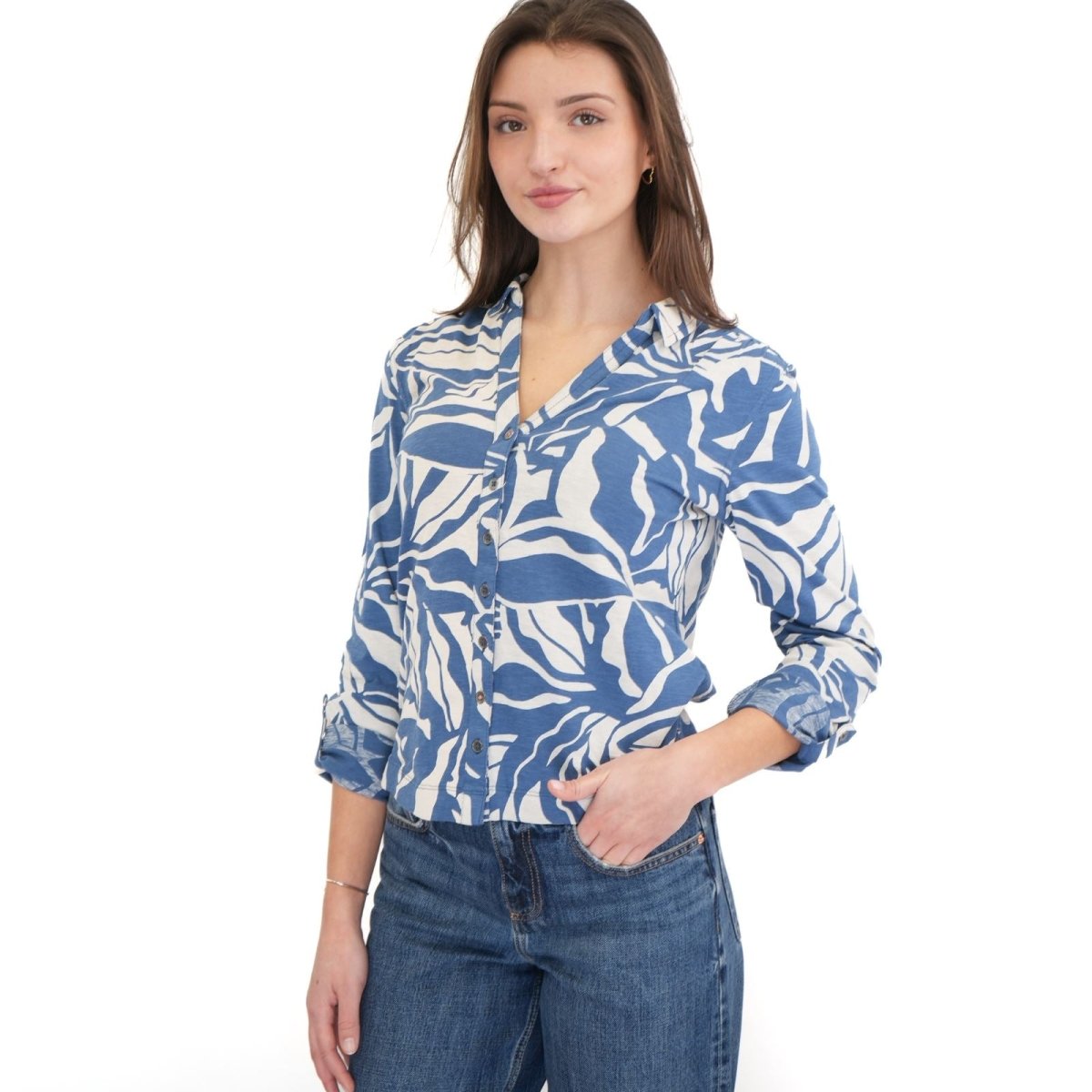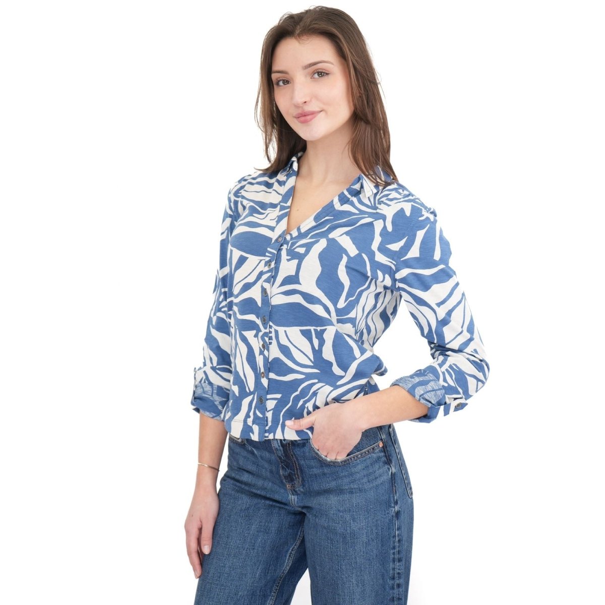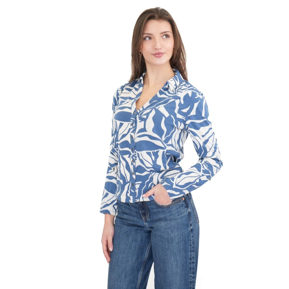 A comfortable and stylish White Stuff Annie Jersey Collared Shirt in Navy Multi, designed with the smart look of a shirt and the comfort of a soft cotton jersey top.