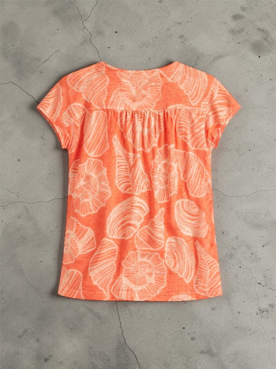 Subtle gathering at the back adds shape while maintaining comfort and movement. The coral patterned fabric adds a fresh and feminine look that works perfectly for casual summer styling.